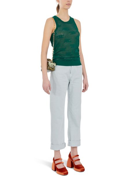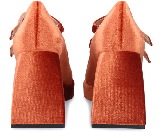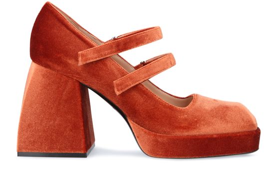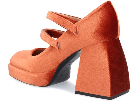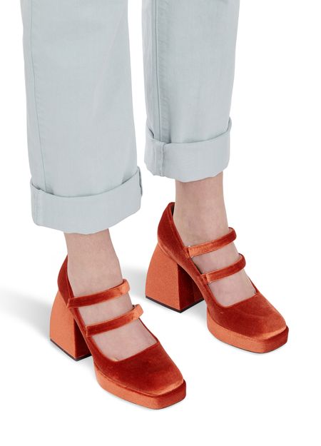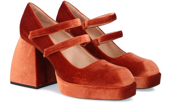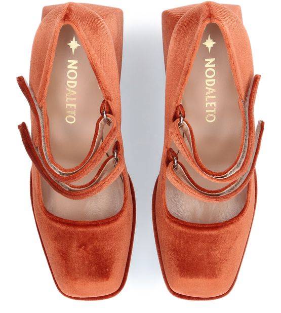 Nodaleto présente les escarpins en velours Babies Bulla, une forme originale posée sur un talon large, évasé où deux lanières soulignent le dessus du pied.