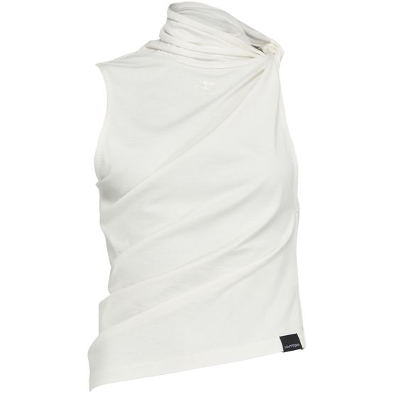 Le chemisier Courrèges Haut torsadé se distingue par son détail drapé et sa coupe asymétrique. Avec un logo à l'avant et un logo brodé, il incarne le classique revisité. L'encolure asymétrique et la surpiqûre visible apportent une touche contemporaine, tandis que le design sans manches révèle une élégance intemporelle.
