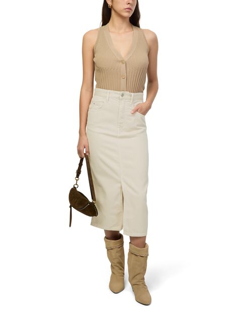 La jupe en denim Tilauria d'Isabel Marant est une pièce midi intemporelle avec une étiquette logo à l'arrière. Dotée de poches latérales et d'une poche plaquée à l'arrière, elle se ferme par un bouton et une fermeture éclair dissimulée. Ses passants pour ceinture et sa fente à l'avant lui donnent une allure moderne.