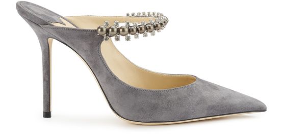 Une élégante rangée de perles encadrées de fins cristaux décore les mules Bing 100. Leur design en daim s'achève sur un talon très fin dans un style authentique signé Jimmy Choo.