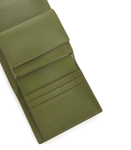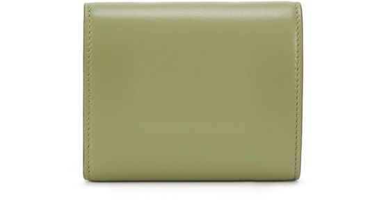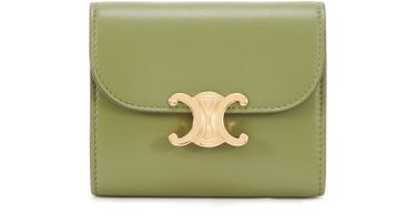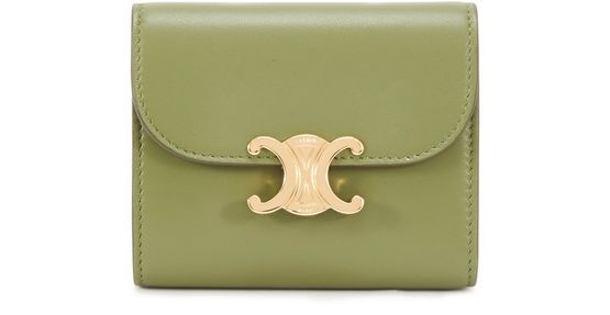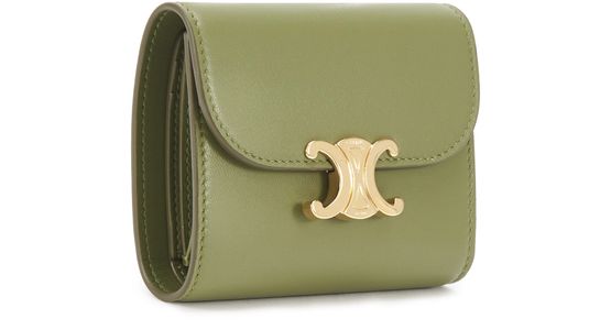 Composé de cinq fentes à cartes, d'un compartiment à billets, d'une poche plate et d'une autre à rabat, ce petit portefeuille Triomphe Agneau Lisse doublé en cuir de veau est orné d'une fermeture métallique à bouton pression emblématique de la Maison Celine.