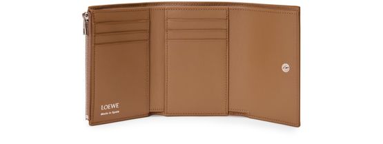 • Description : Six fentes pour cartes, deux petites poches, une grande poch, un compartiment monnaie zipp, fermeture à bouton-pression, doublure en cuir de veau, signature LOEWE embossée.