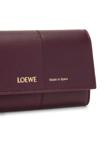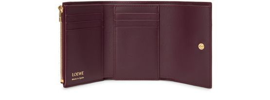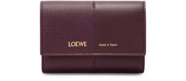 Description : Six fentes pour cartes, deux petites poches, une grande poch, un compartiment monnaie zipp, fermeture à bouton-pression, doublure en cuir de veau, signature LOEWE embossée.