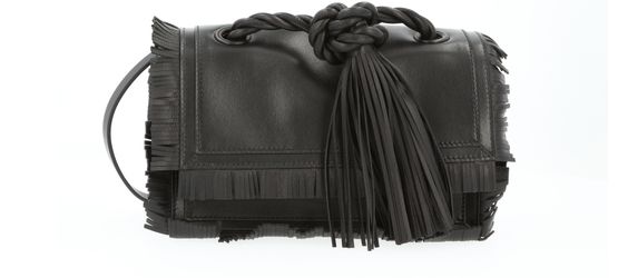Avec cette petite pochette, le créateur italien Valentino Garavani illustre son savoir-faire du cuir. La pochette s'habille de fines franges et d'une poignée en forme de noeud marin.