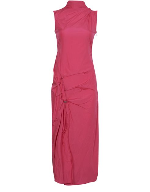 Off-White signe la robe DNA Spiral. Cette pièce présentée lors du défilé est conçue en coton. Elle offre une coupe longue à l'effet pincé sur le devant.