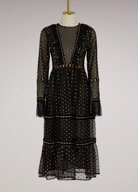 Signée Dodo Bar Or, la robe en soie Juleen est destinée aux femmes intrépides et séductrices. Graphique et harmonieuse, cette création utilise l’alternance des pois et des motifs géométriques brodés en fil doré pour flatter la silhouette et rappeler ses origines du Moyen-Orient. Sa coupe volantée concilie la grâce d’une jupe aux lignes fluide et le charme d’un haut translucide épousant les courbes.