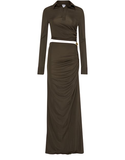 La robe longue fluide en viscose de Bottega Veneta offre une matière fluide et un toucher très doux. Avec un col polo et une coupe ample et fluide, elle apporte une touche élégante et confortable à votre tenue. Parfaite pour toutes les occasions, cette robe est un incontournable de la garde-robe féminine.