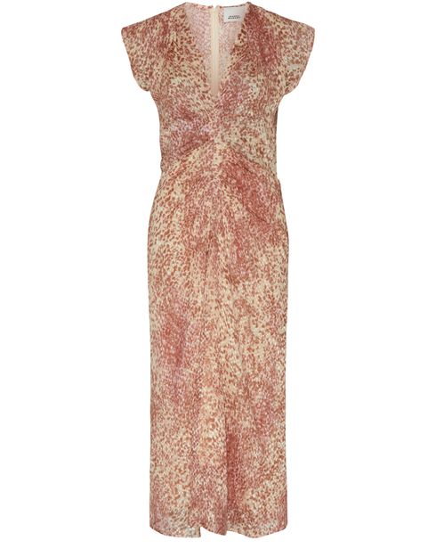 La robe midi Lyndsay d'Isabel Marant séduit par son imprimé all-over et son col en v. Les manches courtes et le détail drapé créent une silhouette élégante. La fermeture à glissière au dos et la surpiqûre visible ajoutent une touche raffinée, parfaite pour les soirées et cocktails. Un must-have pour briller.