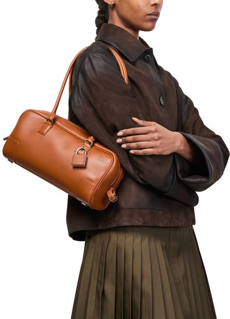 Découvrez le sac en cuir de veau brillant Amazona 23 Cropped de Loewe, confectionné en cuir lisse avec poignée double et fermeture à glissière. Le médaillon Anagram et le logo embossé à l'avant soulignent l’élégance, tandis que les coutures apparentes et les finitions argentées apportent une touche contemporaine.