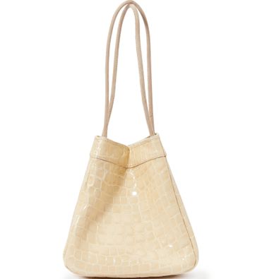 La maison Rejina Pyo nous fait succomber avec ce sac confectionné en cuir de veau et cuir de chèvre, à doubles anses et au toucher peau de crocodile.