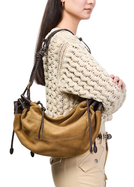 Découvrez le sac porté épaule moyen Maia de Isabel Marant, confectionné en cuir velours avec une poignée unique. Les détails de torsades et les coutures apparentes soulignent un savoir-faire remarquable, tandis que la fermeture par cordon coulissant apporte une note contemporaine.
