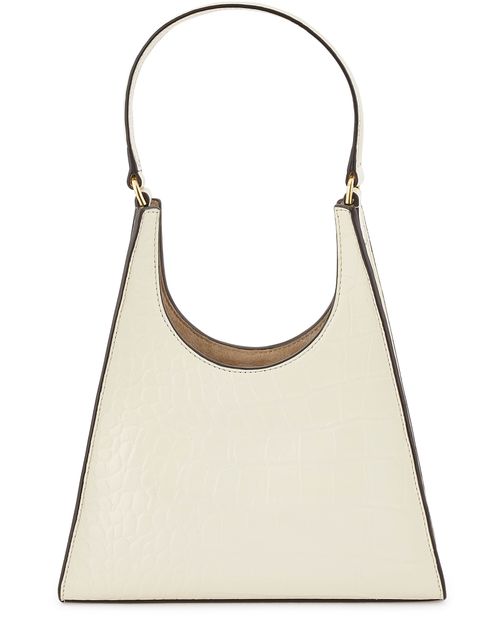 Le sac Rey de Staud présente une forme géométrique, anguleuse d'abord puis qui s'arrondit sous votre bras, laissant sa fine anse posée sur votre épaule.