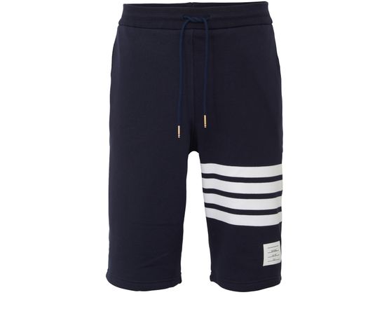 Ce short 4-Bar de la maison Thom Browne à la taille élastiquée se resserrant par cordon, exhibe le nom de sa marque et les 4 bandes sur sa cuisse.
