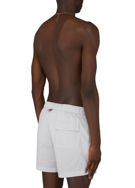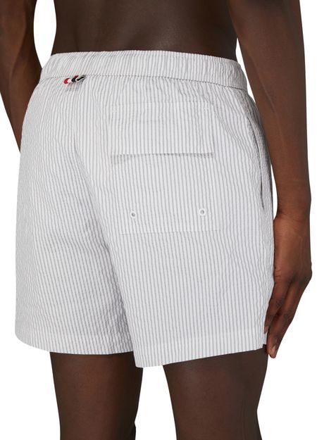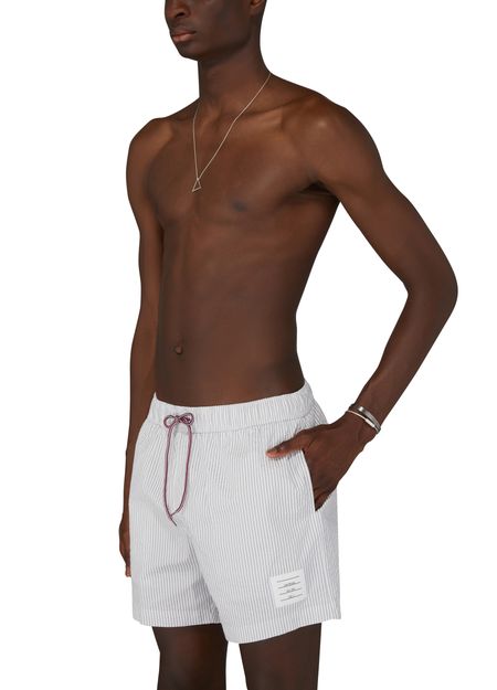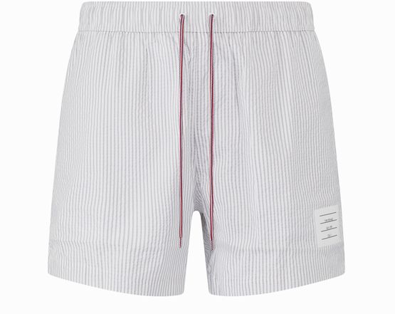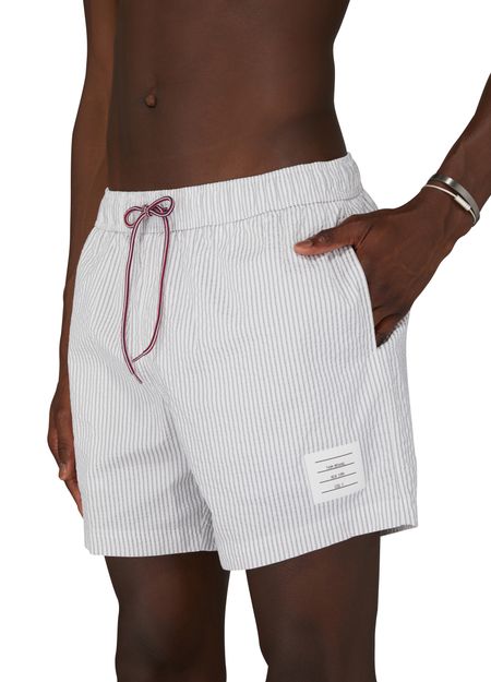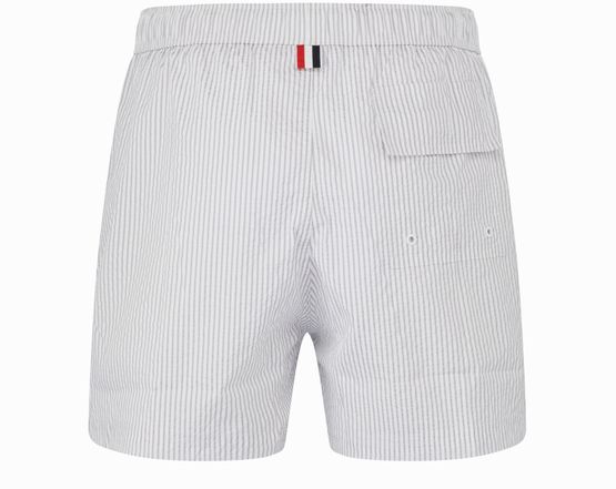 Le short de bain Thom Browne arbore une coupe slim et un design court, parfait pour les journées ensoleillées. Sa taille élastique avec cordon coulissant assure un confort optimal. Le motif rayé emblématique s’allie à l’étiquette avec logo, créant un style à la fois chic et décontracté pour les amateurs de mode.