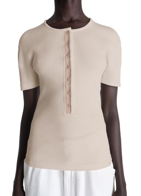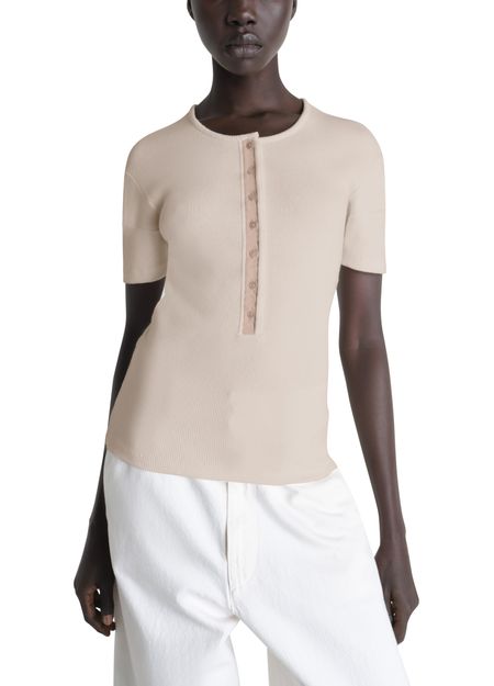 Découvrez le top à manches courtes à encolure ras du cou de Lemaire, rehaussé d'une fermeture à bouton élégante. Sa coupe épurée et son tissu doux s'adaptent à toutes les occasions, que ce soit avec un pantalon habillé ou un jean décontracté.