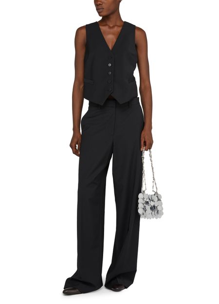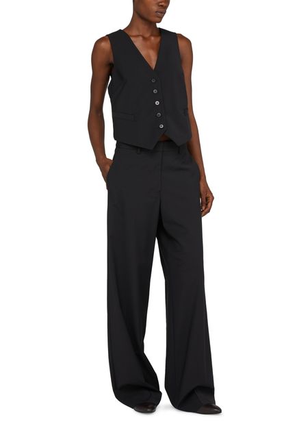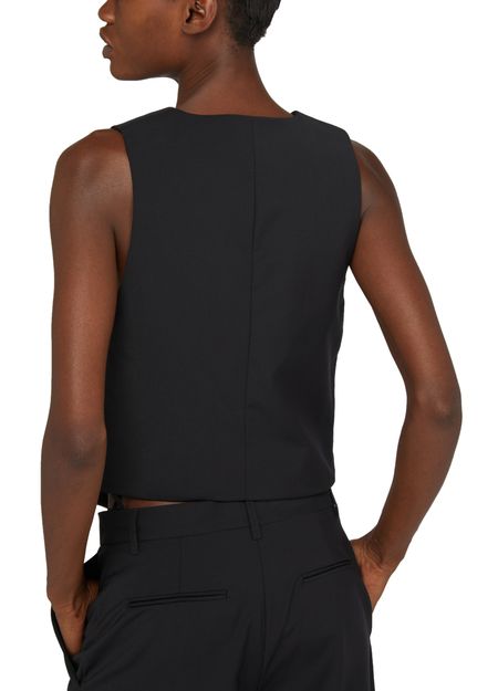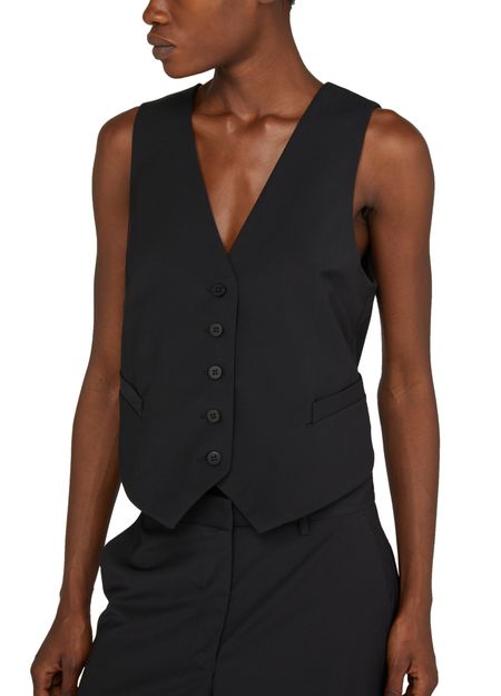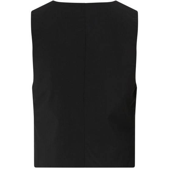 • Description : Veste courte, coupe droite et large, col en V, sans manches, poches passepoilées, fermeture boutonnée.