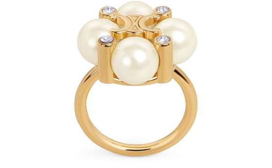 Adoptez la bague Les Perles Celine en strass, ornée de perles en résine et de laiton avec finition dorée. Cette création incarne le raffinement moderne avec audace.