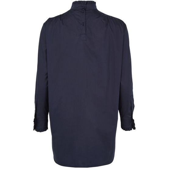 • Description : Coupe ample, long, encolure montante, col élisabéthain, manche à volants, manches longues, empiècement sur le devant, détail godets, fermeture bouton au dos.