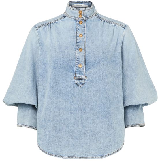 Découvrez la blouse en denim de Zimmermann, confectionnée en denim avec une encolure montante et des manches trois-quarts. Les boutons sur le devant et la surpiqûre contrastée apportent une note sophistiquée, idéale pour sublimer vos tenues du quotidien ou plus habillées.