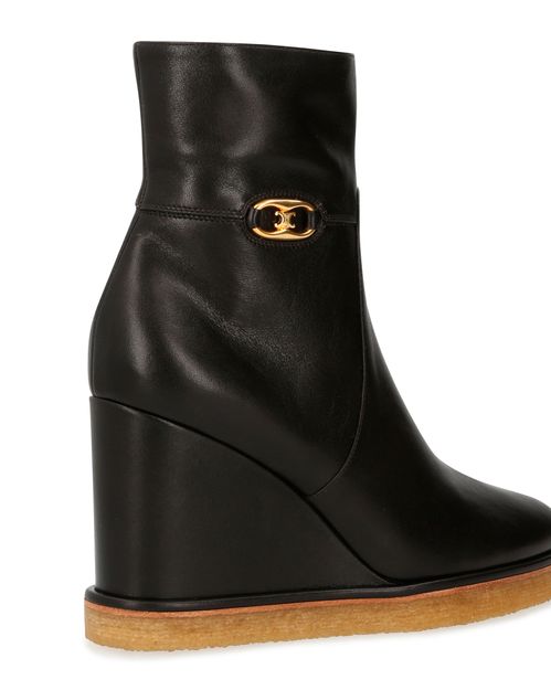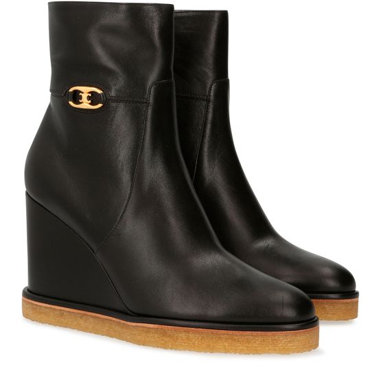L'esprit créatif de Celine franchit de nouvelles limites avec ce modèle de bottines compensées Manon. Une création qui dévoile un talon compensé vertigineux et une coupe audacieuse.