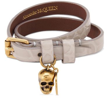Cet élégant Bracelet double tour fait par Alexander McQueen possède un fermoir par boucle et plusieurs coloris. Orné de plusieurs pendentifs, un en tête de mort et l’autre gravé Alexander McQueen, il a de belles finitions dorées.