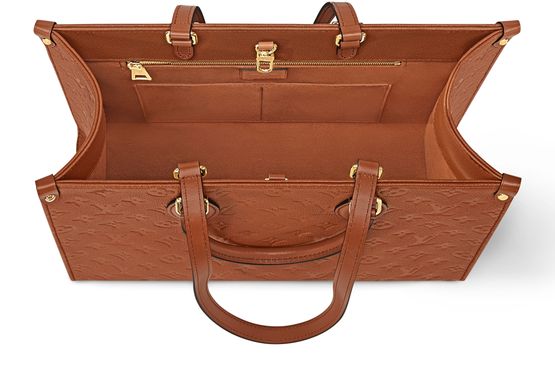 Inspiré des malles vintage, ce cabas OnTheGo MM adopte une nuance de marron profond sublimée par des finitions en métal doré. Assez spacieux pour accueillir un ordinateur portable 13 pouces, il est confectionné en cuir Monogram Empreinte emblématique et présente de multiples poches intérieures. Il se porte par ses poignées supérieures lisses ou par ses longues anses afin de garder les mains libres.