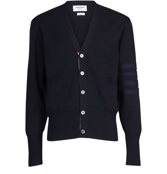 Les hommes habillés par Thom Browne vont aimer le cardigan à col V 4-Bar qui sculpte la silhouette avec sa coupe haute et le détail irrésistible de sa bande de boutonnage rayée.