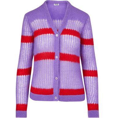 Ce cardigan en mohair mélangé est signé Miu Miu. Cette pièce délicate combine matières nobles, transparence et couleurs douces pour un look moderne et féminin.