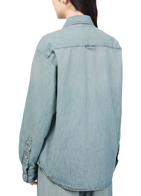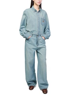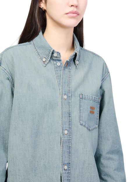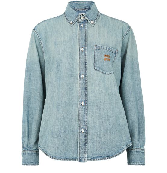 Découvrez la chemise en denim Miu Miu, confectionnée en denim avec une fermeture à bouton élégante et une surpiqûre contrastée. Le logo brodé "Miu Miu" et les manches longues resserrées apportent une allure sophistiquée, idéale pour sublimer toutes vos tenues.