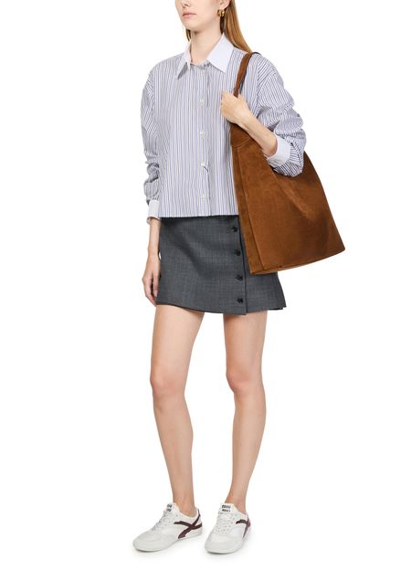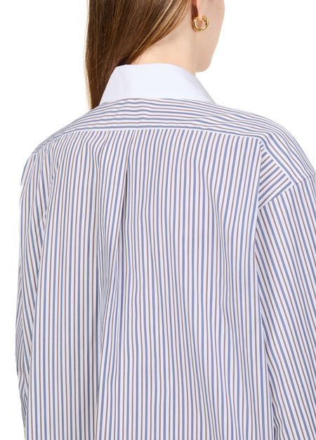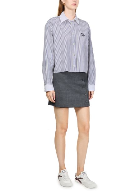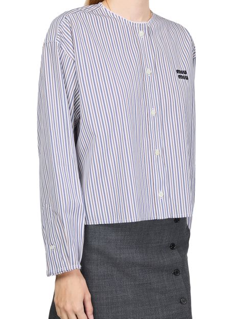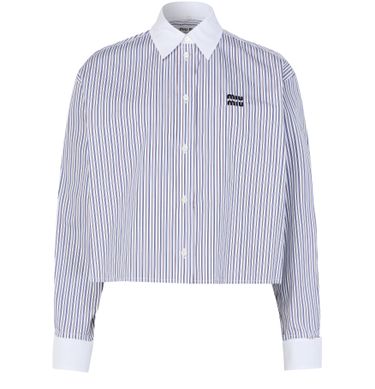 Découvrez la chemise rayée de Miu Miu, conçue avec une coupe boxy tendance et des manches resserrées élégantes. Sa fermeture à bouton et son logo brodé "Miu Miu" ajoutent des touches sophistiquées à ce haut à manches longues. La longueur courte et l'imprimé rayures garantissent un look contemporain, idéal pour être portée avec des jeans ou des jupes taille haute.