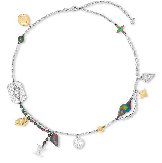 Issu de la nouvelle collection s'inspirant des escapades en bord de mer et des soirées autour du feu de camp, ce collier LV Shell incarne l'esprit outdoor. Cette pièce raffinée associe des coquillages multicolores en PVD, des perles dorées et argentées, des charms emblématiques de la Maison et un pendentif LV Initiales suspendus à une chaîne fine en laiton.