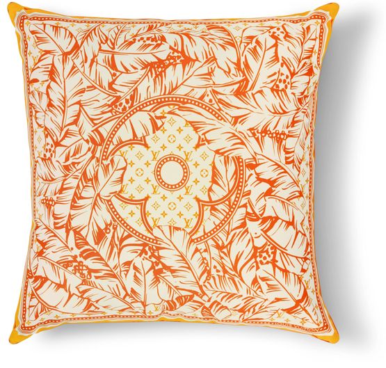 Ce nouveau coussin LV Palms se pare d’un motif exotique créé pour la collection de prêt-à-porter Louis Vuitton. Imprimé sur du coton, il représente une jungle luxuriante de feuilles de palmier tourbillonnant autour d'une grande fleur de Monogram sur un fond Monogram emblématique, rappel discret du symbole de la Maison. Ce coussin finement ouvragé et coloré sublime élégamment un intérieur.