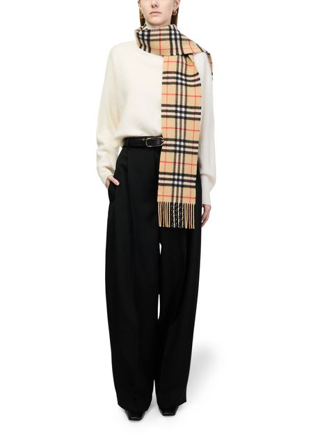 Cette iconique écharpe en cachemire à carreaux Burberry Check est confectionnée en Écosse dans une manufacture fondée en 1797. Tissée sur des machines traditionnelles, l'écharpe est réalisée en plus de 30 étapes. L'étoffe est lavée dans de l'eau de source locale et brossée avec des chardons séchés qui parcourent la surface du cachemire pour relever le tissu, créant ainsi un lustre naturel et une finition...