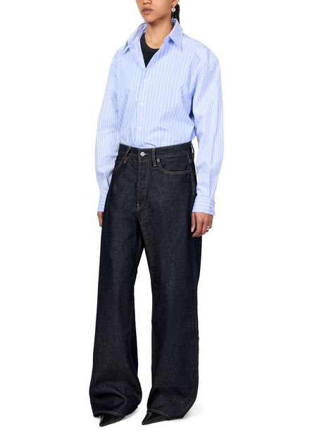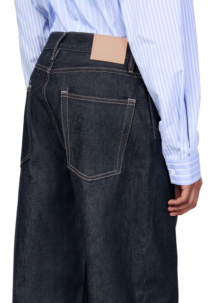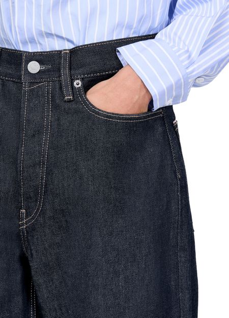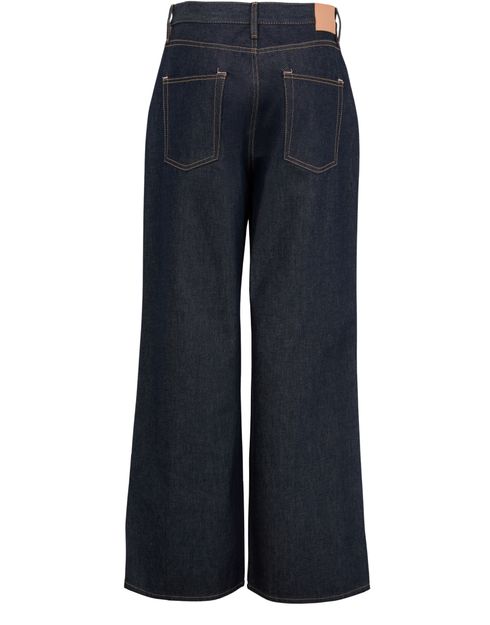 Description : fermeture bouton et à glissière dissimulée, passants pour ceinture, étiquette en cuir à l’arrière avec logo, surpiqûre contrastée, longueur cheville, style cinq poches, denim, coupe ample, modèle taille basse.
