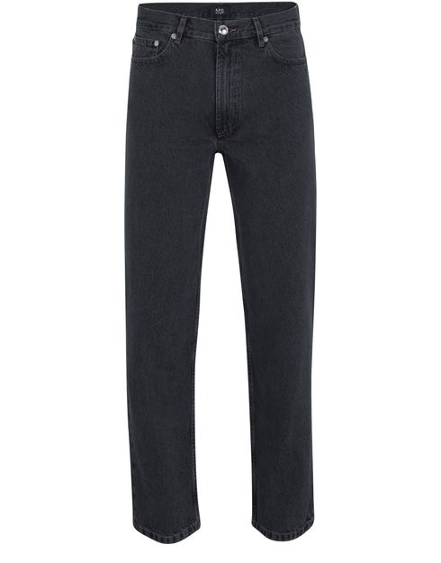 Description : Jean droit, bouton sur le devant, coutures apparentes, deux poches avant, passants pour ceinture.