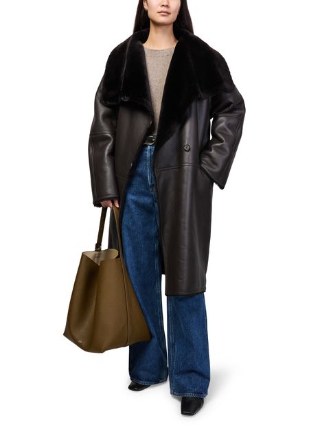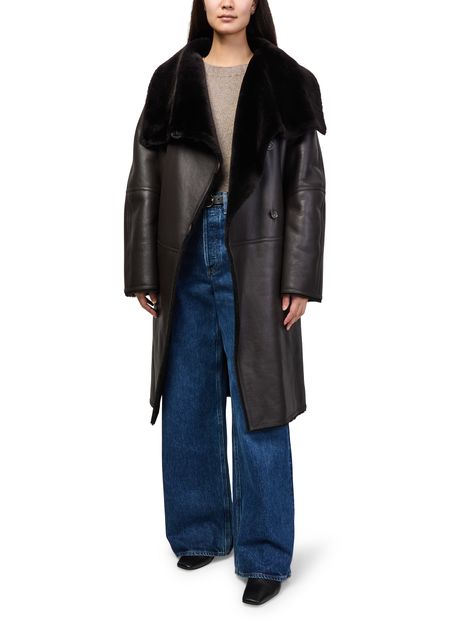Découvrez le manteau portefeuille en peau lainée Toteme, confectionné en cuir lisse pour une allure élégante. Sa coupe longue, son double boutonnage, ses poches latérales et son col classique en font une pièce raffinée et polyvalente, idéale pour sublimer toutes vos tenues contemporaines.