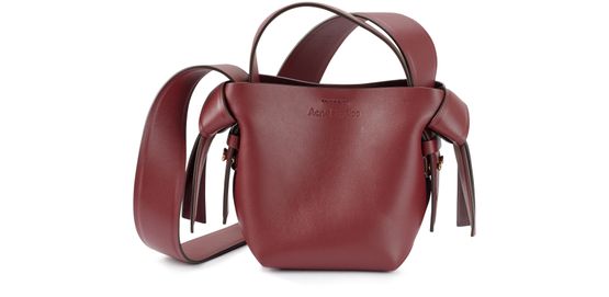 Découvrez le Micro sac Musubi d'Acne, un accessoire polyvalent en cuir doté d'une bandoulière détachable. Ce sac peut être porté à la main ou à l'épaule, avec une poignée supérieure pratique. À l'intérieur, une poche zippée offre un rangement sécurisé, tandis que des nœuds décoratifs et un logo embossé ajoutent une touche de style unique.