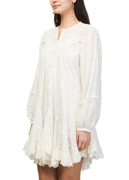 Découvrez la mini robe Zame de Isabel Marant, dotée d'une encolure montante et de manches longues à volants. Les détails en dentelle et volants, associés à une doublure transparente et une fermeture à bouton, offrent une allure raffinée idéale pour toutes les occasions.
