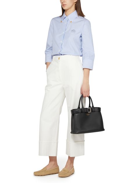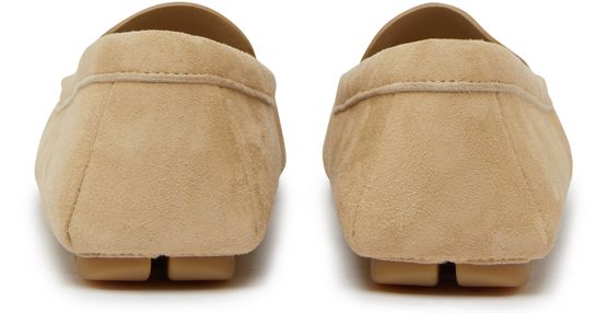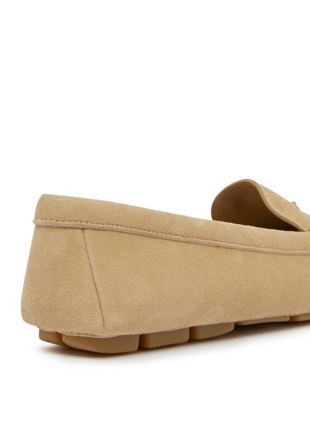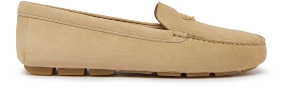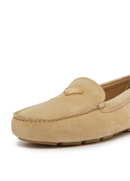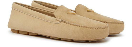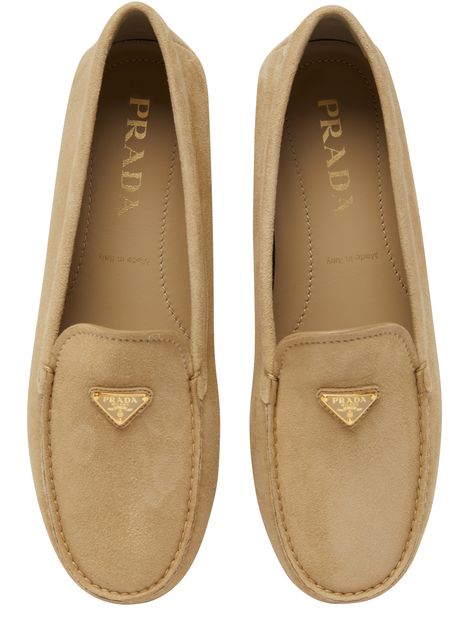 Les mocassins en veau velours de Prada allient élégance et confort. Avec un bout arrondi et un design fermé, ils reposent sur des talons plats. Les finitions dorées et le logo triangulaire, ainsi que le logo métallique à l'avant, ajoutent une touche de luxe à chaque pas.