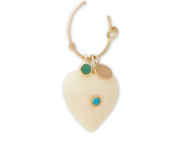 Inspirée des bijoux indiens anciens, la mono boucle d’oreille Heart en turquoise est un must-have de la collection 5 OCTOBRE. Un anneau fin dévoile, au creux de l’oreille, de petites amulettes magiques, dont un cœur doté d’une turquoise au centre. On la porte seule ou accompagnée d’une puce d’oreille.