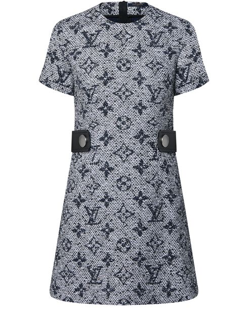 Des éléments emblématiques sophistiqués subliment cette robe d'une allure graphique raffinée. Confectionnée dans le tweed Monogram de laine mélangée de la saison, la silhouette trapèze classique à manches courtes adopte un esprit structuré. Bordées de finitions métalliques polies, des martingales épaisses en cuir soulignent la taille d'une note actuelle épurée. Une fermeture à glissière apparente rehausse le dos.