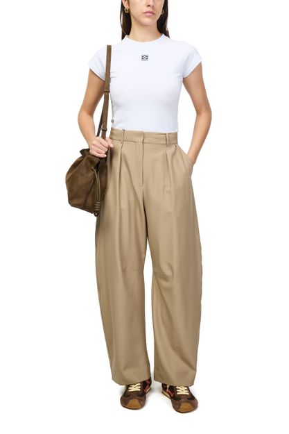 Découvrez le pantalon barrel en laine de Loewe, confectionné avec des pinces à l'avant et une surpiqûre visible. Sa longueur cheville, sa fermeture à glissière avec bouton et ses passants pour ceinture offrent une allure sophistiquée, idéale pour sublimer une tenue habillée ou décontractée.