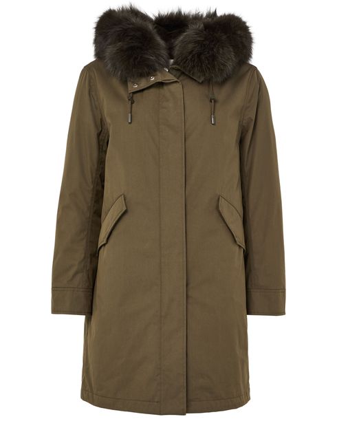• Description : Capuche, manches longues, poches à rabat, fermeture à glissière dissimulée et boutons-pression, détail fourrure.