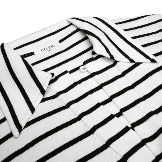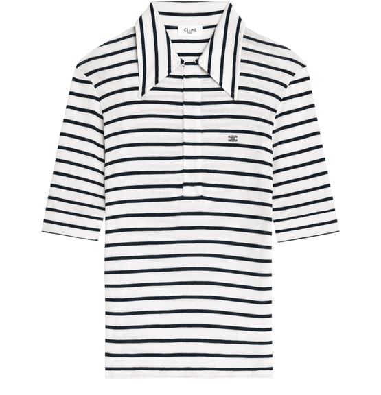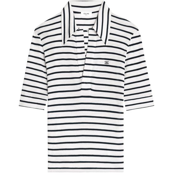 Découvrez le polo jersey soie rayé, chemise brodée Triomphe de Celine, avec sa coupe classique et son col ouvert. Ce modèle est subtilement rehaussé d'un bouton en nacre gravé Celine Paris, apportant une touche de sophistication intemporelle.