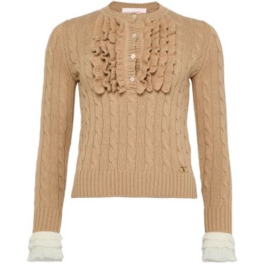 Le pull en maille Valentino, classique et élégant, se distingue par ses boutons sur le devant et ses détails volants délicats. Avec des manches longues resserrées et un logo appliqué à l'avant, il allie raffinement et confort. Le logo brodé ajoute une touche finale, affirmant un style intemporel.
