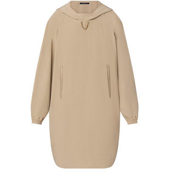 Cette robe propose une version épurée et contemporaine d'un classique sportif. Évoquant la silhouette décontractée et confortable d'un sweatshirt à capuche, elle est réalisée en crêpe de Chine en soie fluide qui lui confère une allure sophistiquée. Sa coupe ample est complétée par des manches chauves-souris volumineuses. Une chaîne ornée d'un LV Circle signe discrètement le col.
