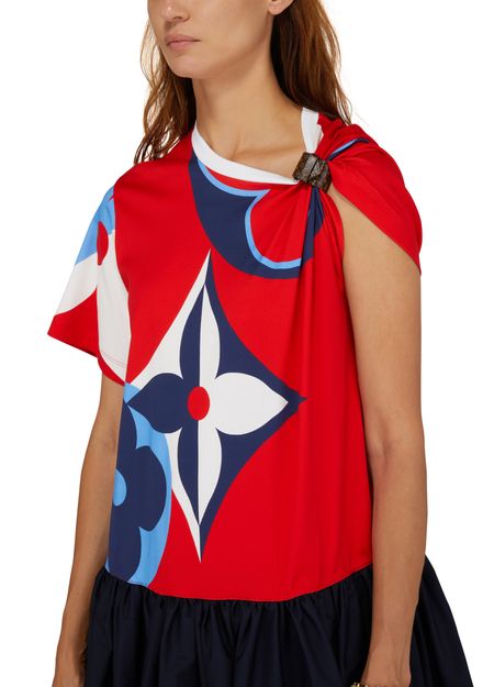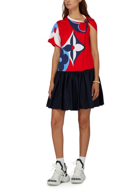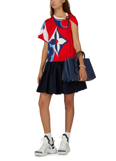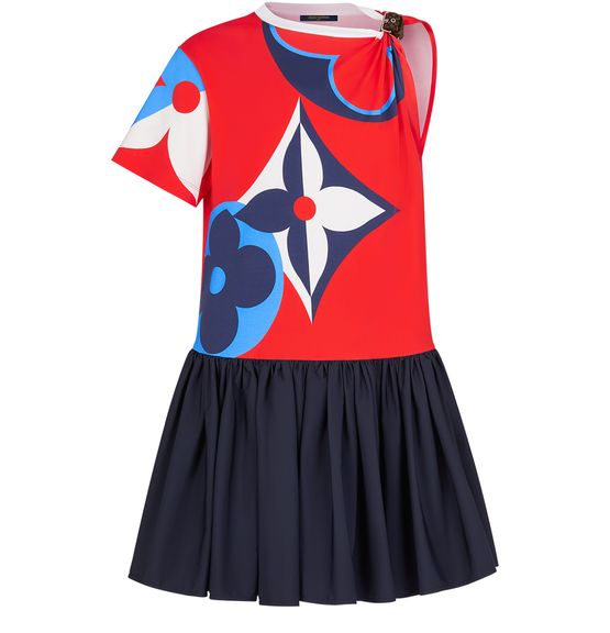 Cette robe baby-doll est un jeu de proportions et de symétrie. Confectionné en jersey imprimé, le haut met à l'honneur des fleurs de Monogram géantes dans une palette vive qui l’inscrit dans la capsule Game On. Une manche est maintenue par une boucle en toile mini Monogram qui crée un effet drapé tandis qu’une jupe ample en popeline de coton complète la silhouette.