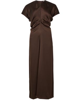 Découvrez la robe drapée de Toteme, une pièce longue et élégante avec un col rond et des manches courtes. La fermeture à glissière au dos et le détail drapé ajoutent une touche de sophistication, idéale pour toutes les occasions.