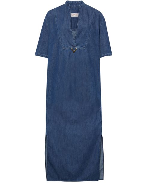 • Description : Robe longue, manches courtes, encolure en V, fentes latérales, coupe ample, jean bleu délavé.