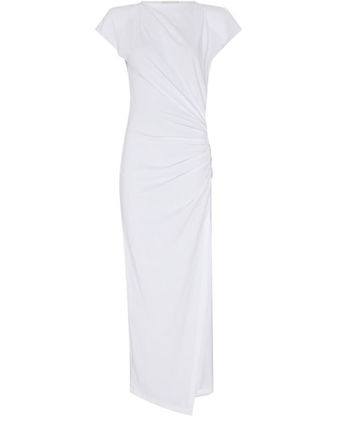 La robe longue Nadela d'Isabel Marant incarne l'élégance contemporaine. Son détail drapé sublime la silhouette, tandis que l'encolure ras du cou et les manches courtes offrent une allure raffinée. La fermeture à glissière dissimulée au dos et la surpiqûre visible ajoutent une touche d'originalité, mettant en valeur le logo appliqué.